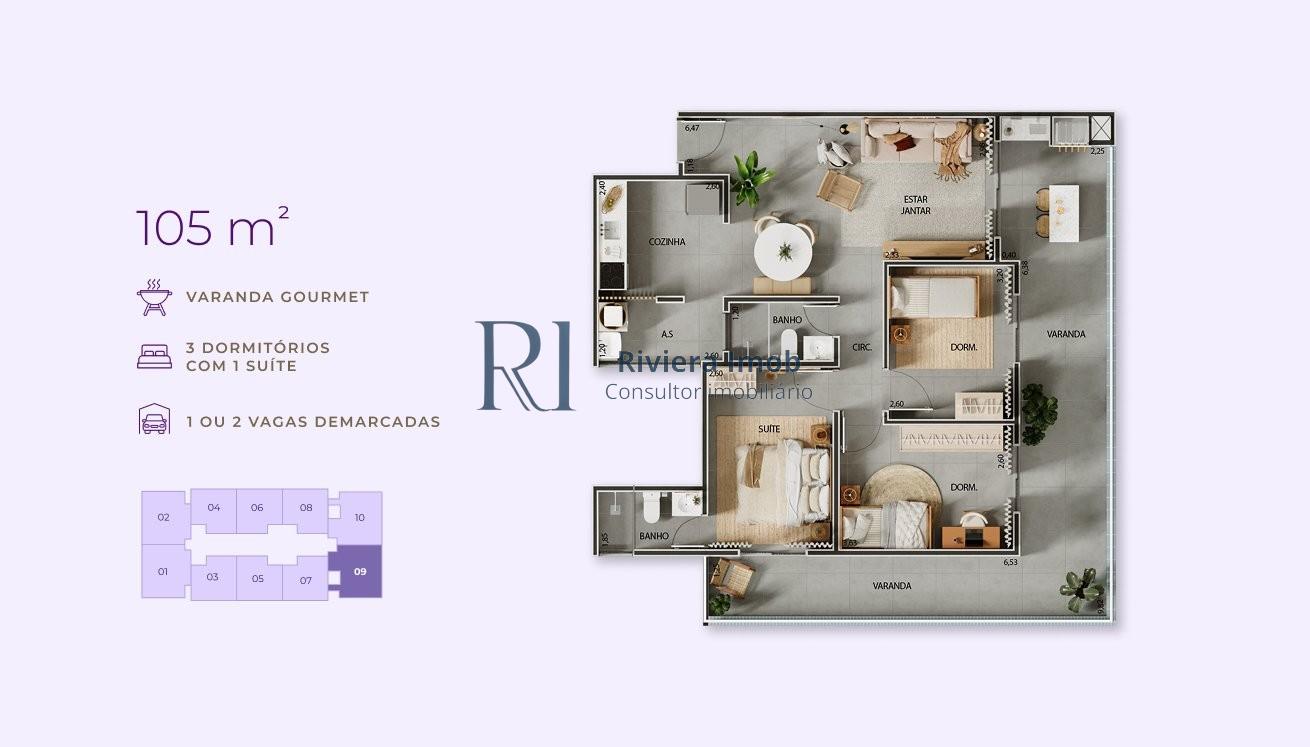 Unidades entre 77 m² e 186 m², com opções de 1 a 3 dormitórios (com 1 a 2 suítes) e 1 a 2 vagas de garagem.